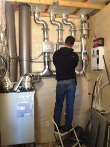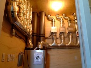 At the teachers’s union building, a 1 kilowatt heater is used in each of the three main ventilation air supply ducts to provide heat to the three offices. In general, this is the main source of heat for the building. A ductless mini-split air source heat pump is in place in the large meeting room and can provide additional heat capacity when required (though its inclusion in the system had more to do with meeting peak cooling demands in the summer). Through this year’s very cold February weather, the system had no problem keeping the building warm and comfortable… pretty impressive given that the heat source is the equivalent of running two toasters!