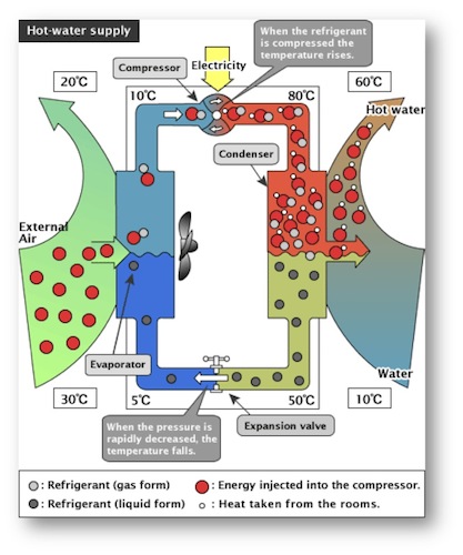 A heat pump works by circulating a refrigerant with a boiling point that is designed to be in the temperature range expected on the outside of the building. By compressing this gas and forcing it into a gaseous state and then allowing it to return to a liquid state, the refrigerant goes through two phase changes. The heat that is transferred during these phase changes is significant, even though the temperature of the refrigerant is not.