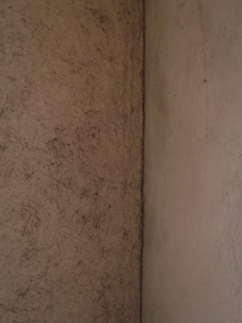 Similarly, there were leaks along the edges of a few of the prefab straw bale wall panels. They were detailed in a similar way to the site baled walls, with an air fin under mesh around the edges of the plaster. And again, some worked very well and others did not. We’ll have to do more thinking about how to make this a more effective and reliable detail on future builds.