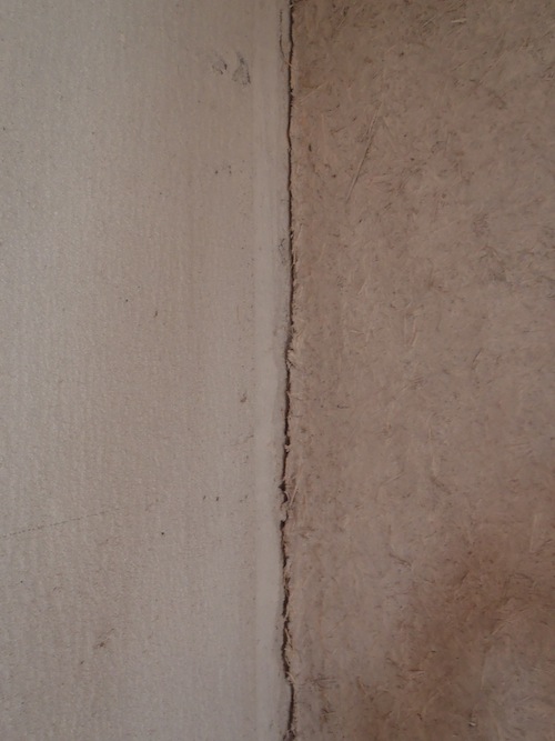 By far the leakiest area was around the edges of our site-baled north wall. Despite using air fins at all the seams with the prefab walls and the ceiling, the upstairs north wall was leaking significantly all the way around where the plaster had shrunk away from the edges. A quick calculation of this 1/8″-1/4″ gap all the way around the whole north wall says that this could account for almost all the leakage area Matt detected.