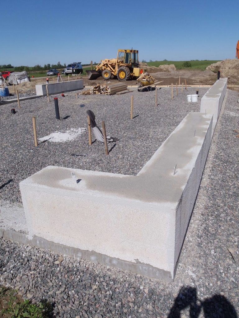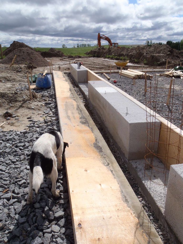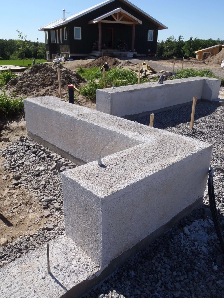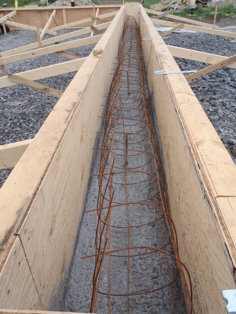 The Poraver grade beam was 16 inches wide (to match the width of the plastered bale walls it supports) and 24 inches tall. It will be partially below grade once the building has been backfilled and graded.