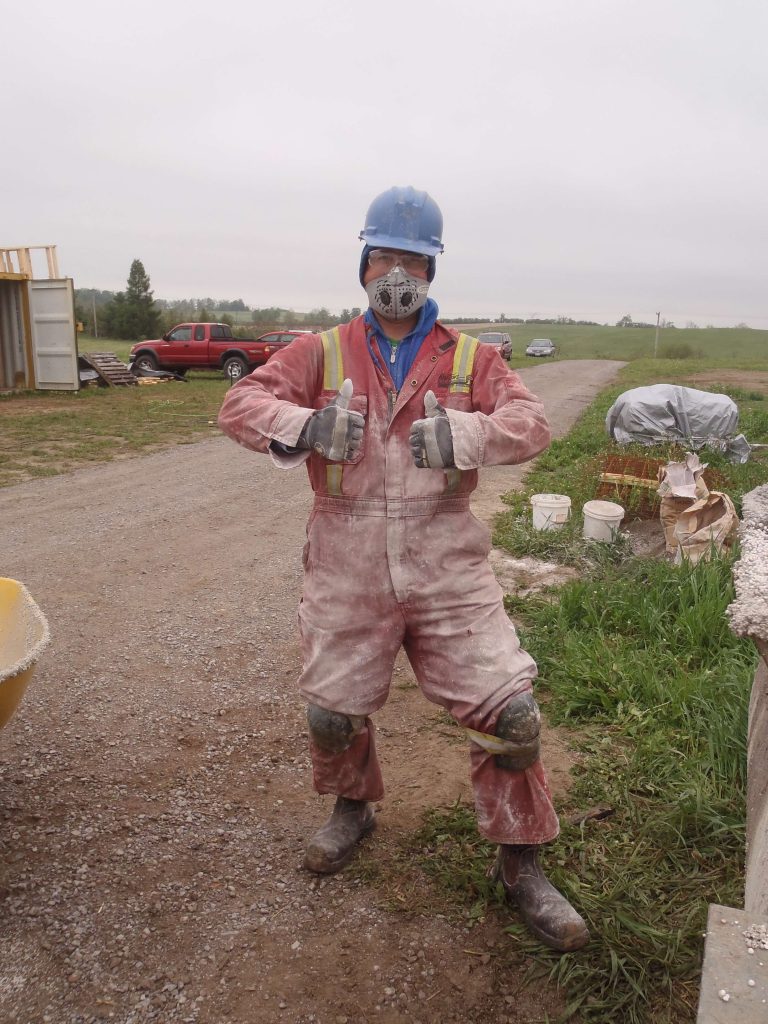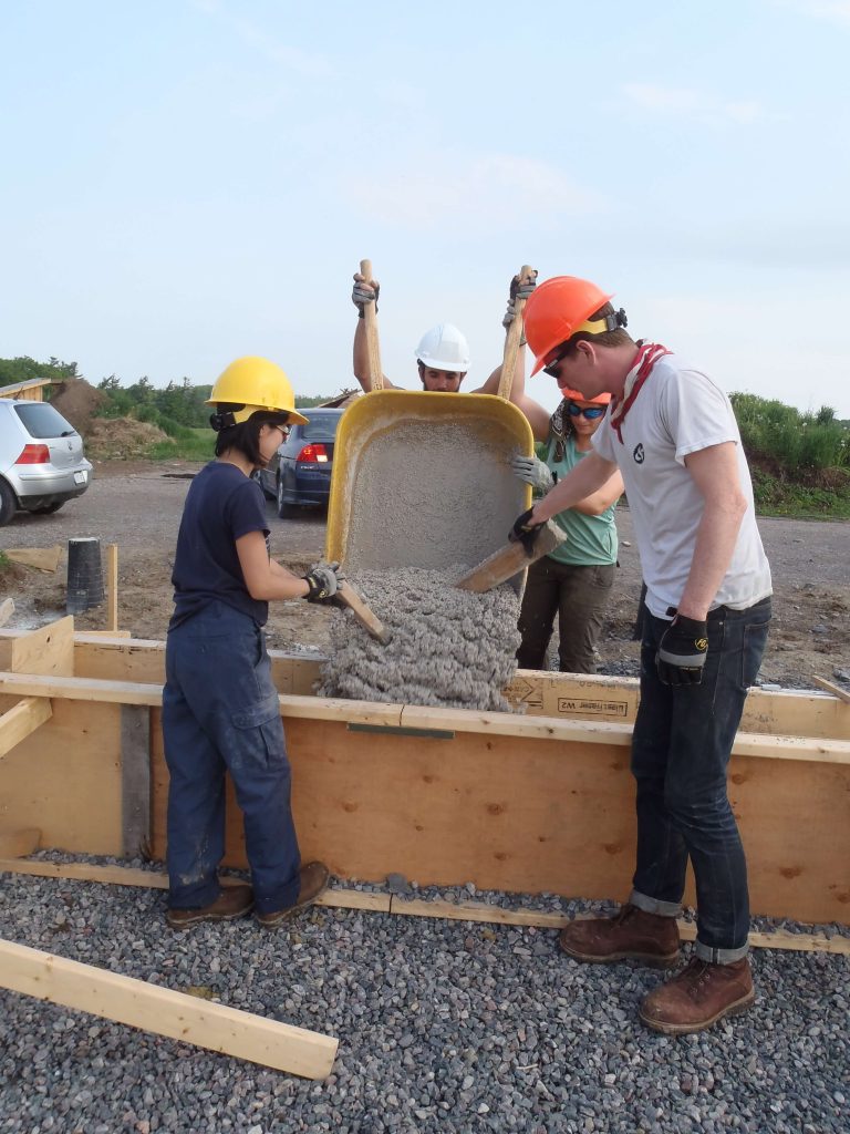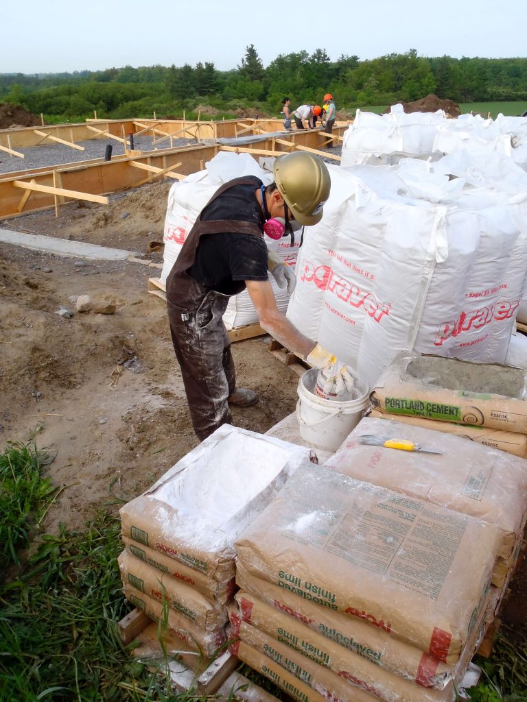 As we reported last year, the Poraver product is made from recycled glass that is “aerated,” giving it a cellular structure that is strong but containing enough air pockets to have a good insulation value. As a dry insulation, it can be used in many infill applications, and it is frequently mixed with cement to make lighter weight concrete. The “magic” for us, however, is that a by-product of making the Poraver balls is fired clay, called metakaolin. Metakaolin is a pozzolan, which means that it can be mixed with local hydrated lime to create a hydraulic lime. Hydraulic lime achieves a large percentage of its curing by consuming water, much like cement, meaning a much faster set time, much higher early strength and the ability to use lime in thick applications like a foundation wall. Suddenly, we have a locally produced material that is made from recycled content, and we also use the by-product of the process! Eliminating foam and cement from a foundation with side benefits!
