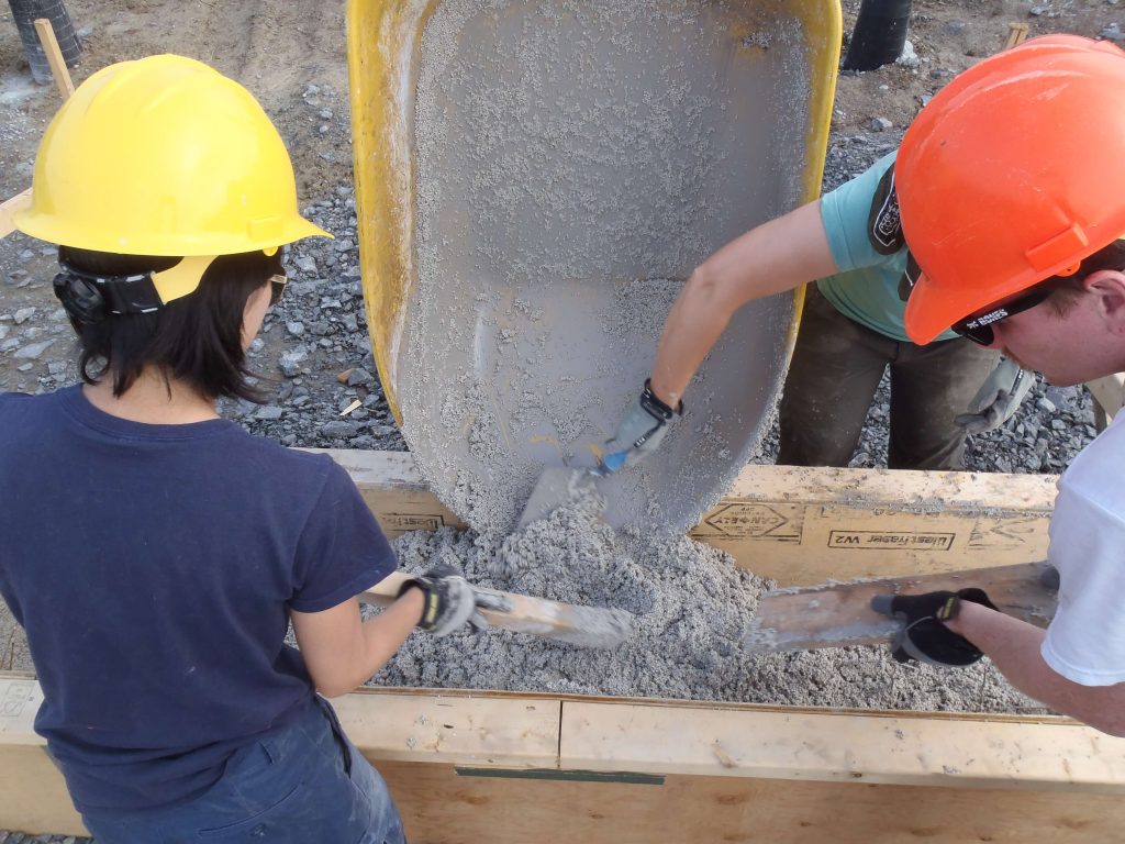 The mixed material was poured into a form, much like concrete. Once in the form, we spread it and compacted it to ensure it was fully distributed in the forms without any air pockets. The material was hard to the touch in 24 hours, and we removed the forms after 48 hours.