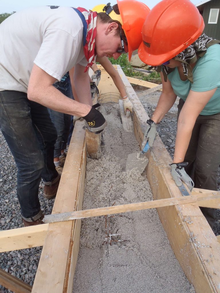 We started with a thin, 3-1/2 inch concrete grade beam on top of our rubble trench. The grade beam is below the floor level of the building, and added the bending strength required for the foundation. It is possible that the Poraver could be strong enough without the concrete beam underneath it, but further testing would have been required to justify this, so we went with a thin beam. The concrete was poured in the same formwork we used for the Poraver, simplifying the construction process.