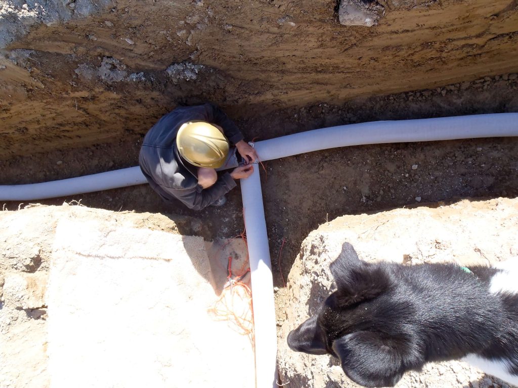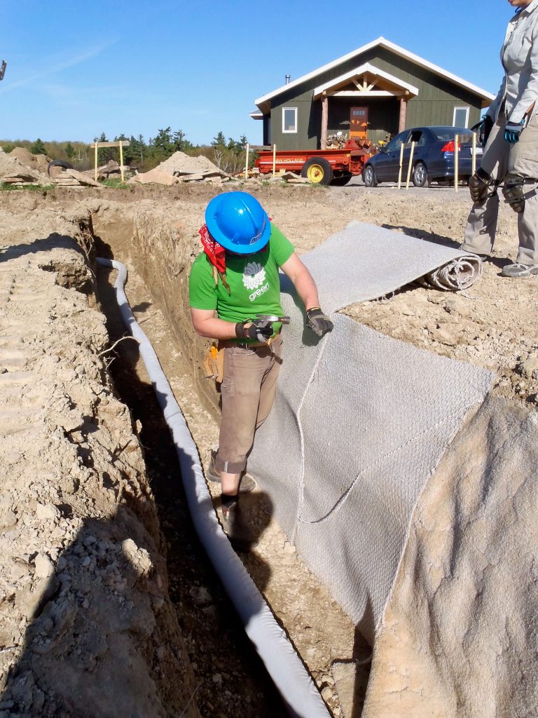 Water that may make it into the trench drains through the stone to a drainage tile at the base of the trench. This drainage pipe slopes around the building and terminates in a “dry sump” where any water can accumulate and percolate into the ground away from the foundation.