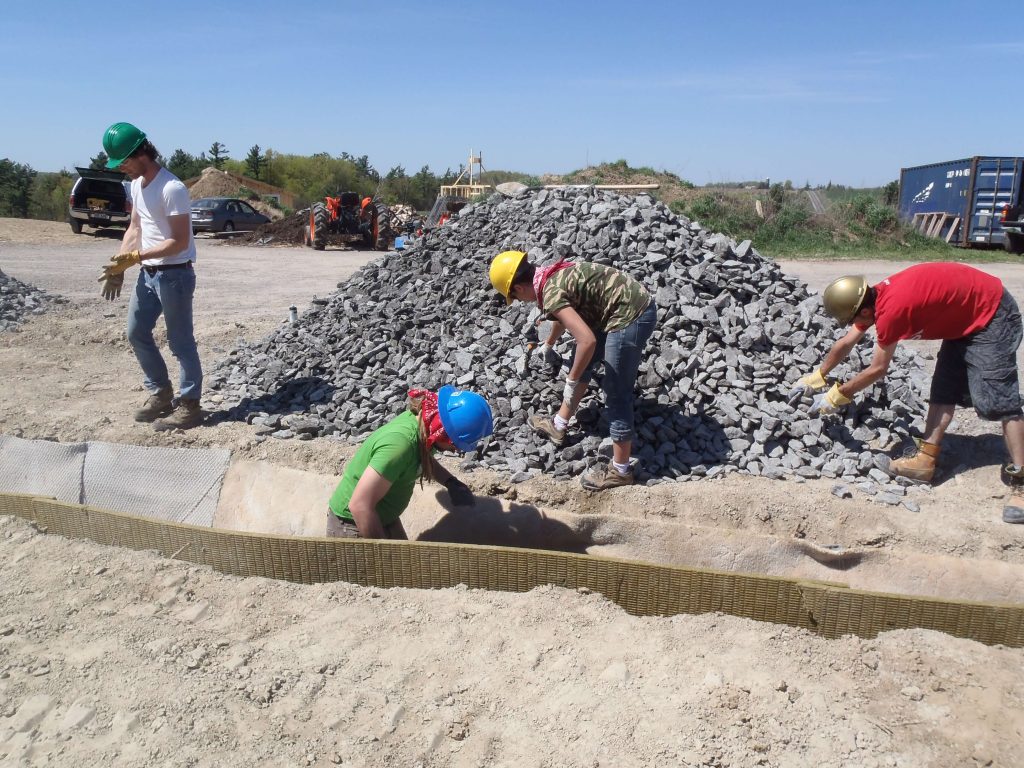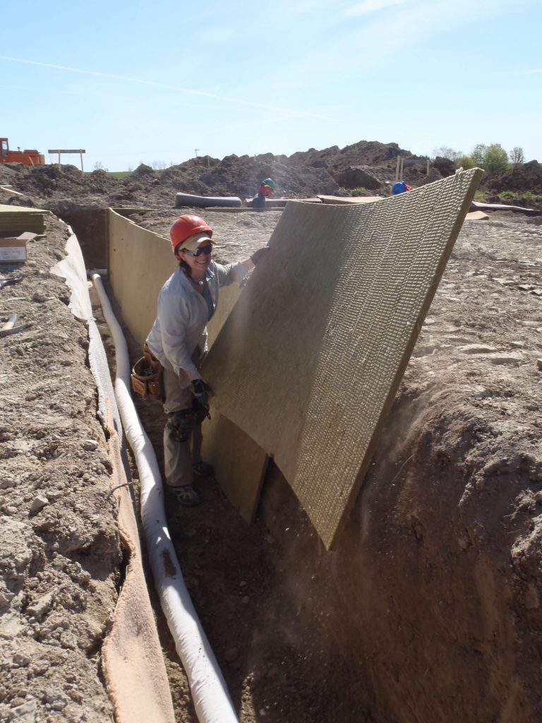 On the outside of the trench, we also used Roxul Drainboard, a recycled mineral fiber board that is free draining and provides a more significant thermal break. Insulating a rubble trench foundation isn’t necessary, but we are applying solar heat to the ground under the building, and wanted to keep that heat from migrating into the surrounding soil.