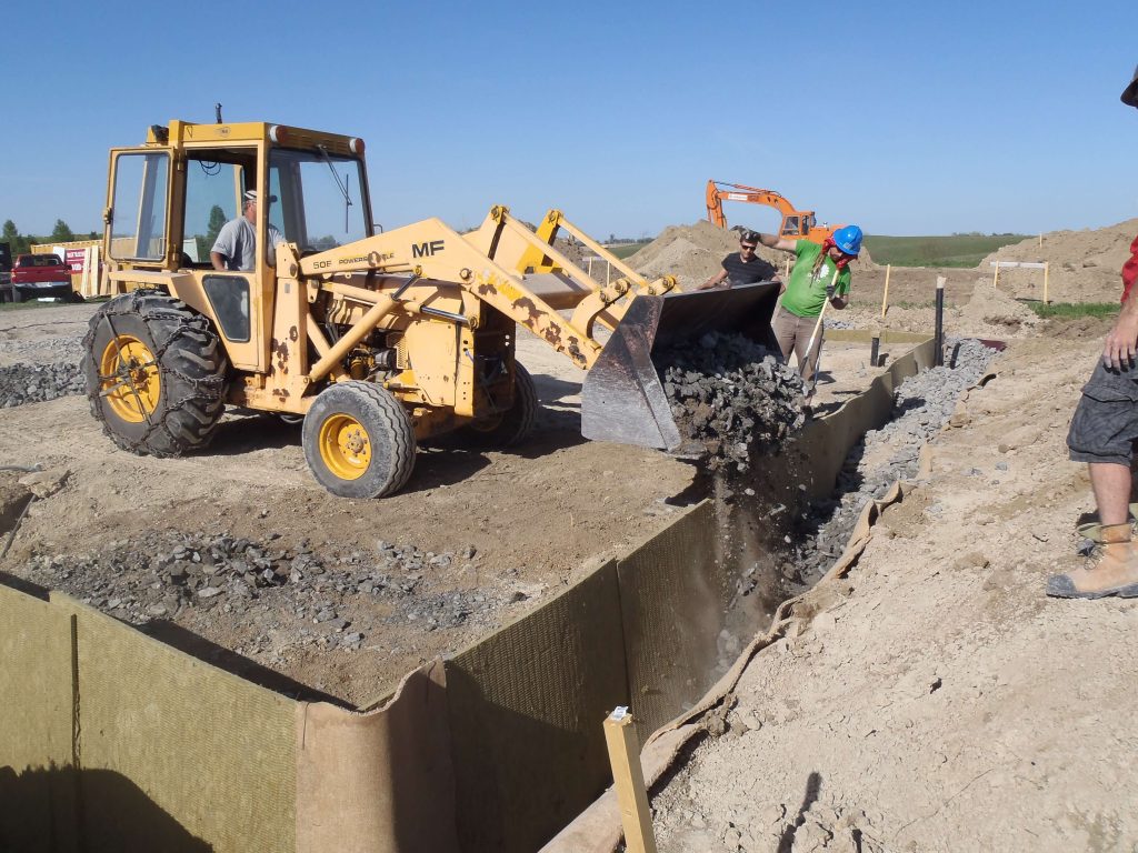 For the Circle Organic building, our rubble trench was 4 feet deep and about 2 feet wide (the width of a backhoe bucket). We used a grade of local crushed stone called 2-4 inch clear stone. This means the fines have been washed out, leaving a rock that is very well draining.