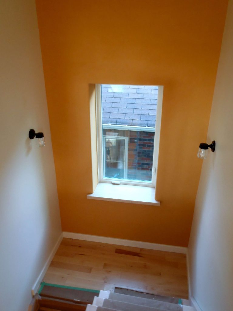 Auro lime paint is a completely natural, non-toxic finish that comes in several different texture options, from a fine and highly polished “tadelakt” version up to a fairly grainy and textured version. We chose a lightly grainy texture, and mixed the white base paint with a natural pigment supplied by Auro (in Canada from Tockay). While a primer is available for this paint, we brushed it directly to raw drywall in two coats with excellent results.