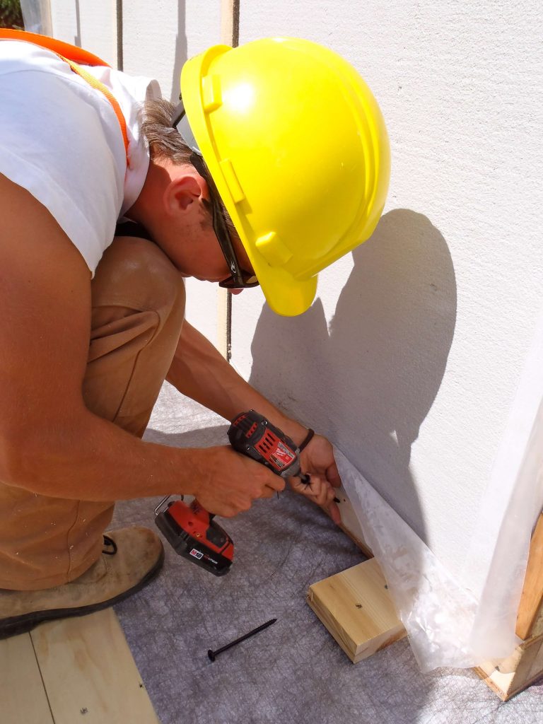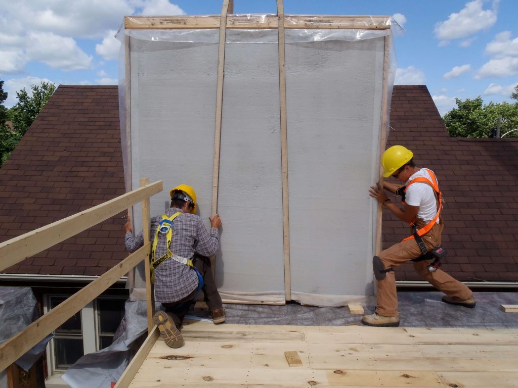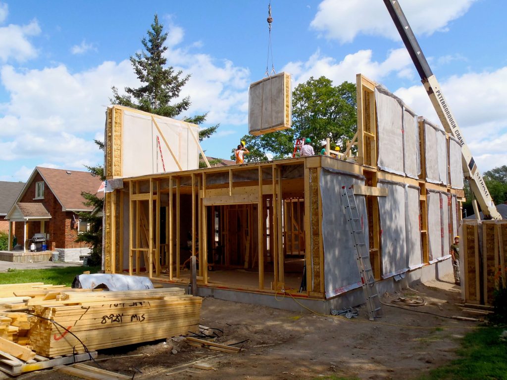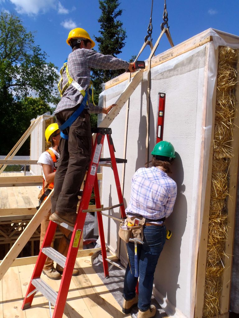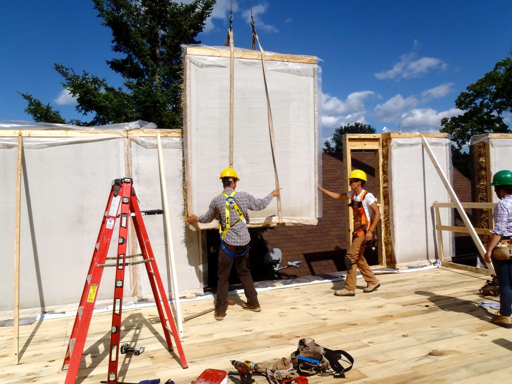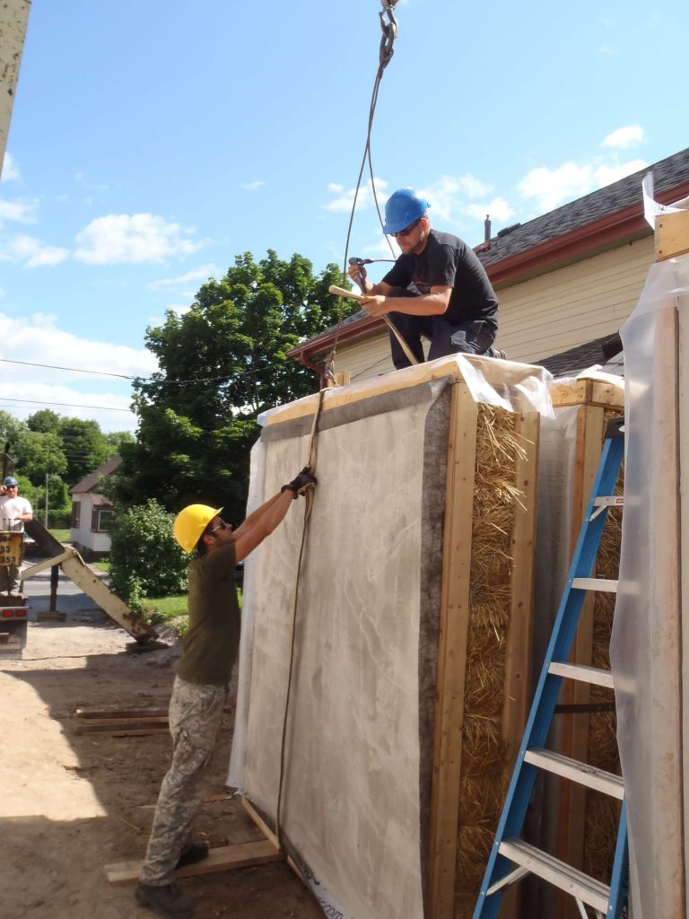 In a repeat performance of crane work and team work, the Endeavour crew installed the prefabricated straw bale wall panels on the second story of the home.