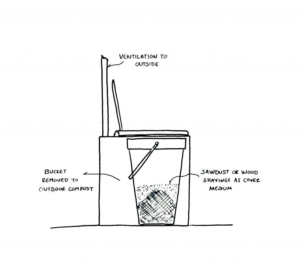 This low-tech version of the composting toilet uses a bucket or similar portable receptacle placed under a seat/container to receive humanure deposits. Sawdust, wood shavings, chopped straw or another form of cellulose material is used to cover each deposit in the toilet, helping to reduce odor, absorb urine and provide aeration. Once full, the bucket is emptied into an outdoor compost heap. Here the material is layered and mixed and covered with more cellulose material, providing the right conditions for the natural conversion to compost/humus.