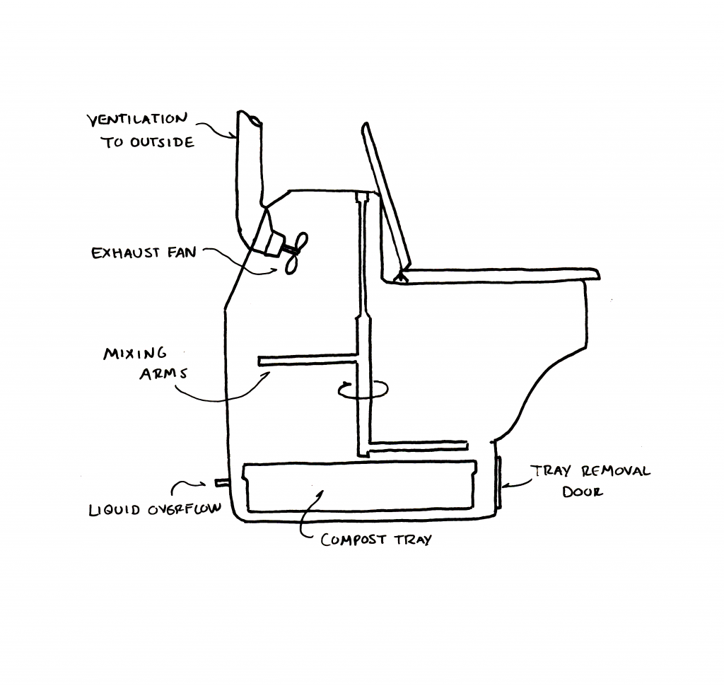 These units provide a seat over an integral composting tray in a single, self-contained structure. Humanure deposits are received in the tray and provided with the appropriate conditions for composting action within the unit. These toilets all use some form of mechanical ventilation to reduce odor. Excess urine may require a separate handling system, or heat may be used to speed evaporation. Due to limited storage capacity, these toilets normally use some form of mechanical action and/or acceleration for the composting process and are only suitable for low numbers of users or for intermittent use.