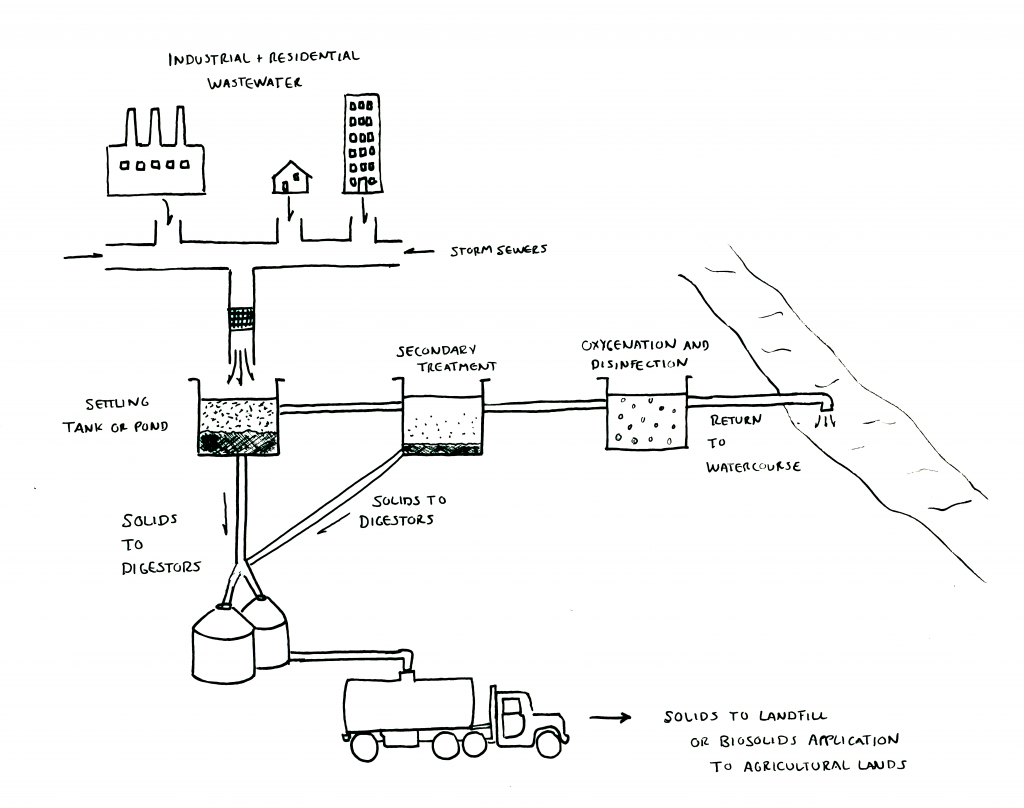 Sludge treatment — In every cubic meter of wastewater, there is between 80 to 220 grams of solids. This aspect of treatment facilities is often overlooked when volumes of treated water are discussed. Sludge is subjected to different treatment processes, from landfill disposal to digestion, drying and finishing. It is often highly contaminated and only partially treated before being used as fertilizer, resulting in contaminated surface water and soil.