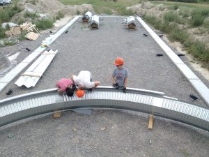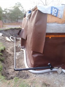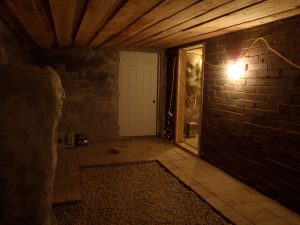 Our approach with the Seasoned Spoon root cellar was to try to have the base subterranean soil temperature be the determining influence on the root cellar temperature. The cellar was designed to be entirely earth bermed, with the walls buried in soil and the roof covered with a minimum of 2ft of soil. To keep the cellar from getting too cold, we insulated the roof area as we were concerned that outdoor temperature might cool the cellar down too much. The ventilation tubes for the cellar were run around the perimeter of the footings before we backfilled, providing 60-70 feet of “earth-tube” for each of the two intake pipes, and this was also done to ensure that freezing winter air was tempered so as to not lower the cellar temperature.