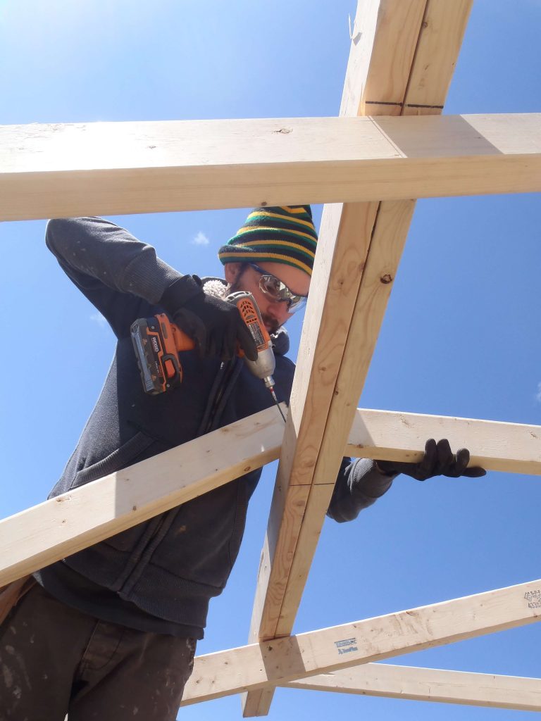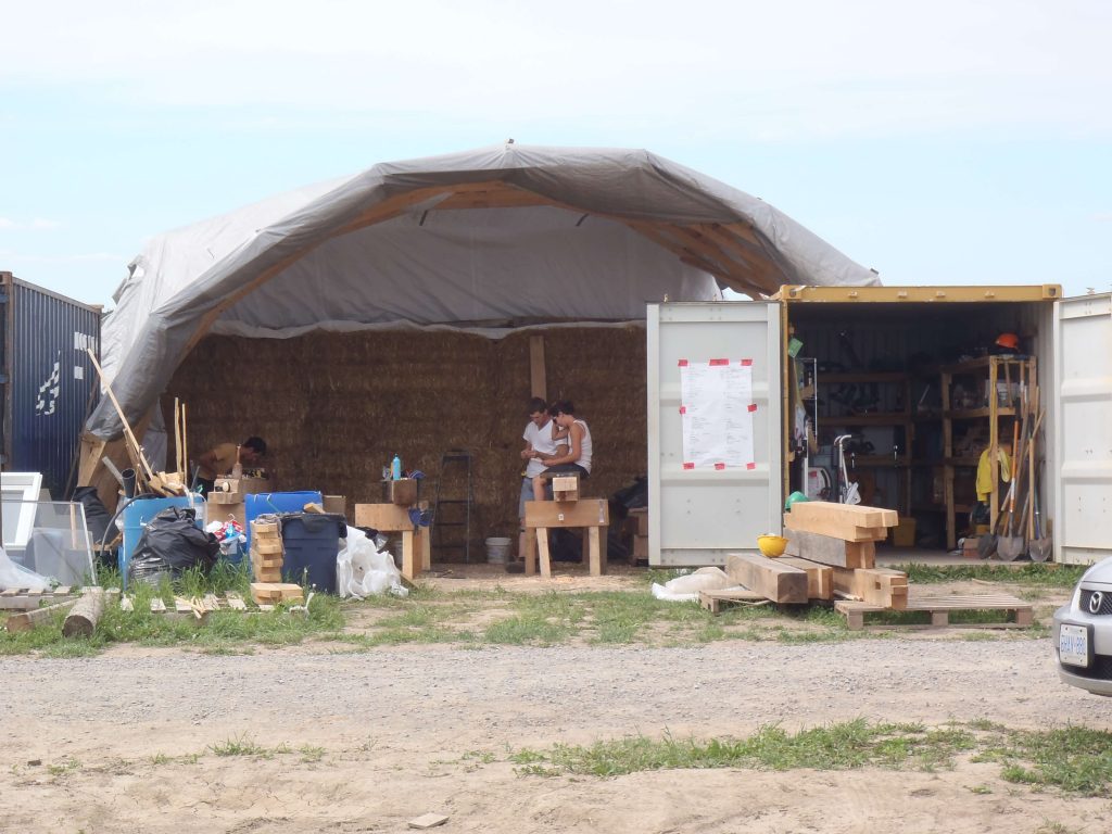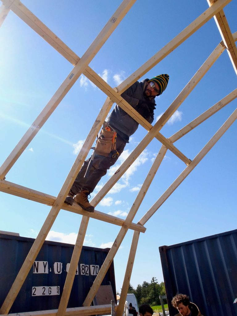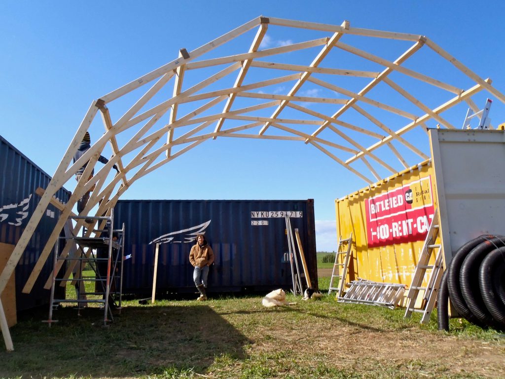 Inspired by Leonardo Da Vinci’s self-supporting bridge we decided to build a roof shelter for our work area to protect us from the elements. The idea is that a structure can easily be built by weaving wooden joists into an arch to create a self-supporting structure.