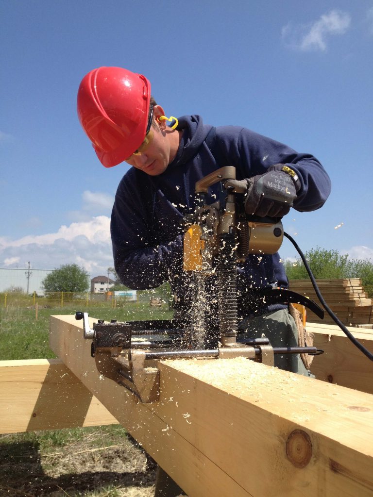 After completing the marking, the joinery was cut using a combination of classic hand tools (saws and chisels) and power tools (circular saw, mortise cutter and drill). In general, the power tools made the big rough cuts and hand tools were used to clean up and refine the cuts to ensure tight, smooth joints. We then drilled the holes into the mortises for the pegs that will hold all the joints on the finished bents.